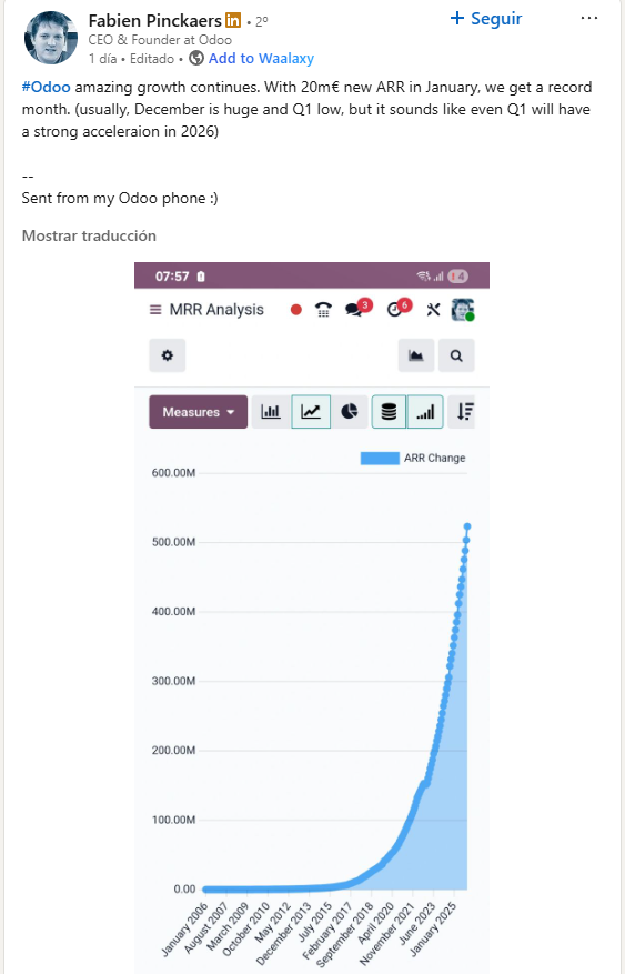 Hoy me levante y vi en X una publicación de David Álvarez donde mostraba lo que el CEO y fundador de Odoo ha publicado en su LinkedIn: +20 millones de ARR a su cuenta en enero, sumando una facturación mensual de ¿520 millones de euros?