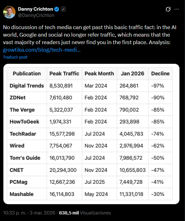 Los principales medios de tecnología están cayendo a un ritmo que da miedo y los motivos os los podéis imaginar: las redes sociales no mandan tráfico para retener al usuario, Google no manda tráfico para retener al usuario, los LLM no mandan tráfico fuera para retener al usuario...